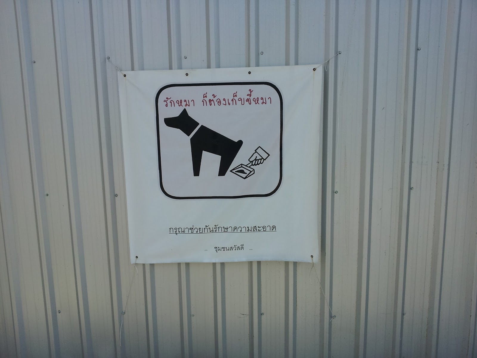 In general Thailand is very clean. They have lots of street sweepers (human.)Here is a sign on a wall to remind people. There are very few pets, a few cats.